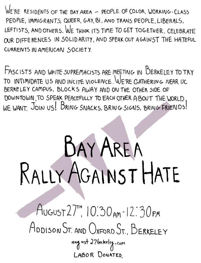 August 27th starting at 10:30am, join people from all walks of life – the people that make the Bay Area what it is – at the Bay Area Rally Against Hate in Berkeley.