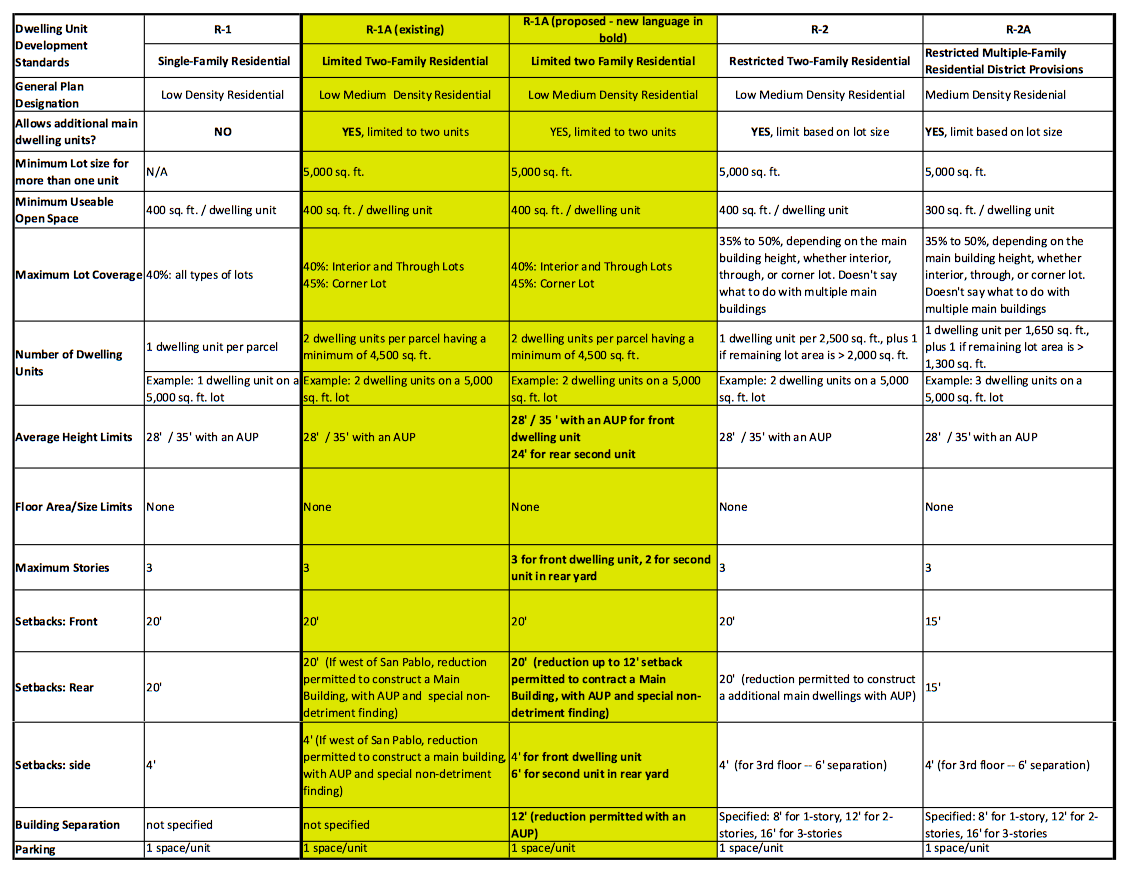 At first blush, these are minor differences that might only matter to policy wonks interested in micro-managing housing development. And you’d be correct. What is of interest to East Bay for Everyone is the fact that R-1A and R-2 have legalized building two family sized homes on one lot.