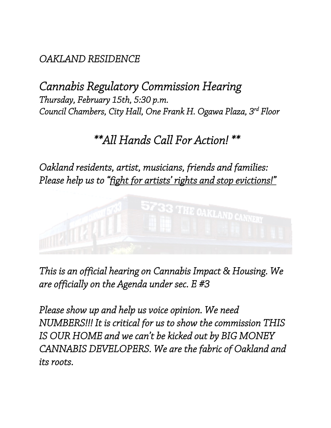 This Thursday at 5:30pm, the Oakland Cannabis Regulatory Commission is holding a hearing on the impacts of commercial cannabis operations on the city’s housing supply. While everyone loves pot (or at least the 65.2% of Oaklanders who voted for Measure Z love pot), many of the warehouse spaces targeted by urban cannabis farmers are currently inhabited by Oaklanders. These commercial growing operations can be extremely lucrative and could significantly increase displace pressure on vulnerable tenants.. An eviction epidemic triggered by Big Pot’s expansion would be a huge bummer that would harsh anyone’s mellow. East Bay for Everyone is asking our members and supporters to show up to Oakland City Hall this Thursday at 5:30pm to speak out in support of protective and equitable policies.